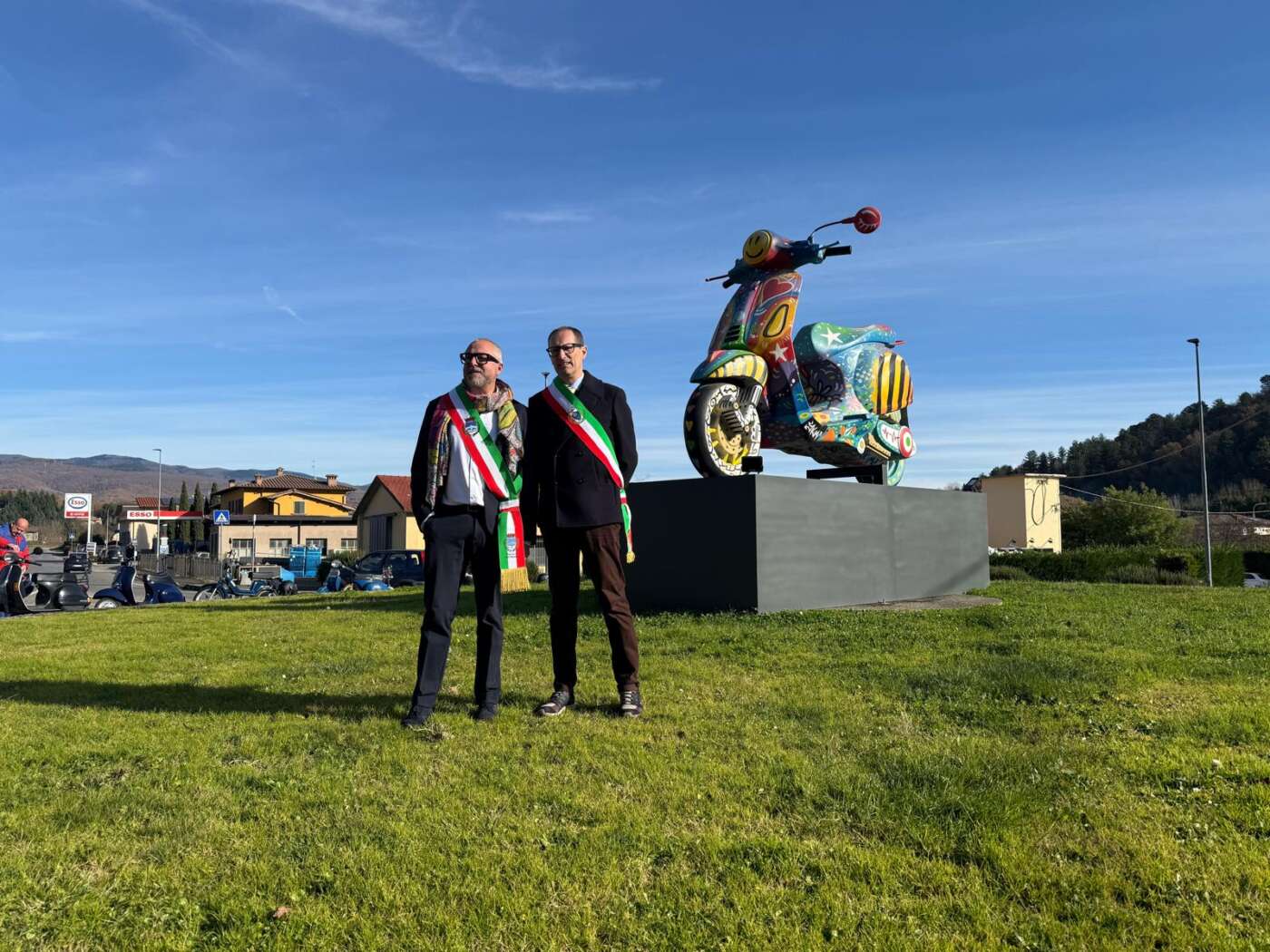 A Strada in Casentino era presente anche l’artista Francesco Forconi in arte Skim, che ha firmato due delle tre opere presenti nel paese in questa speciale occasione, tra cui la Vespa gigante che ha trovato posto nella rotonda che ospita l’opera di Tomaino, Comunità.
