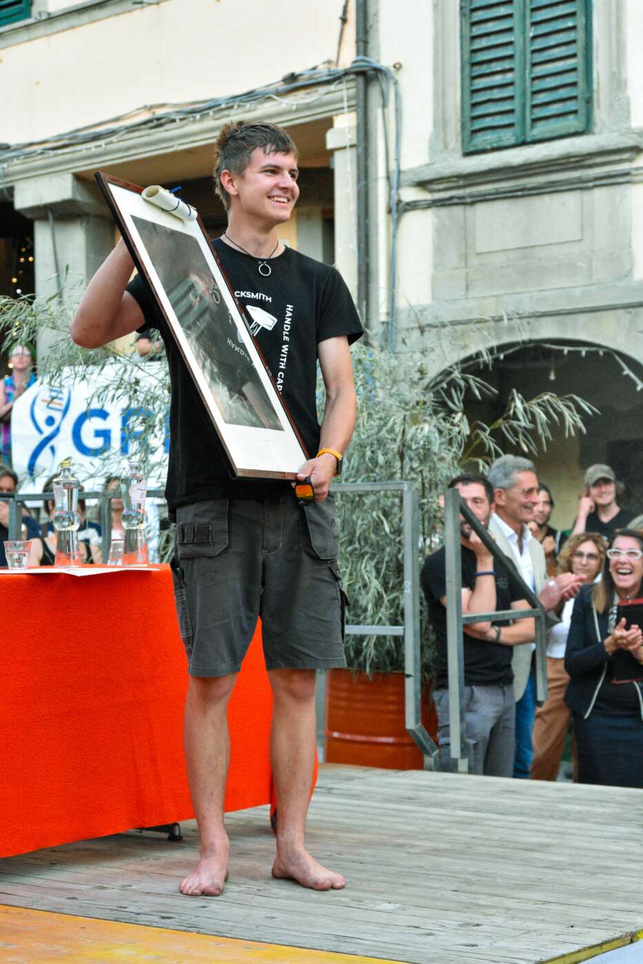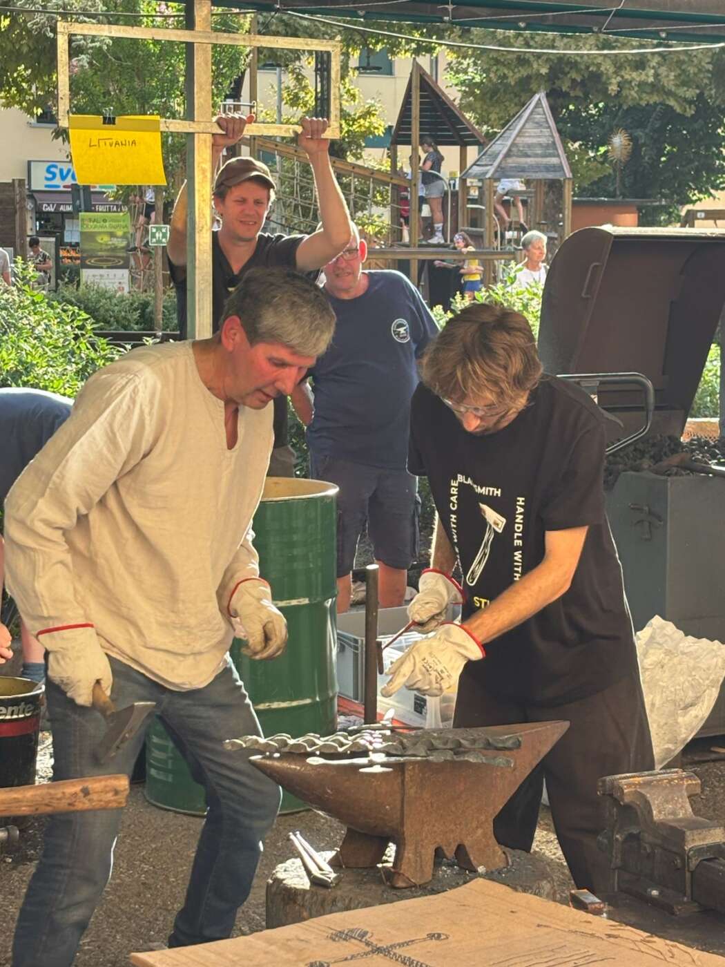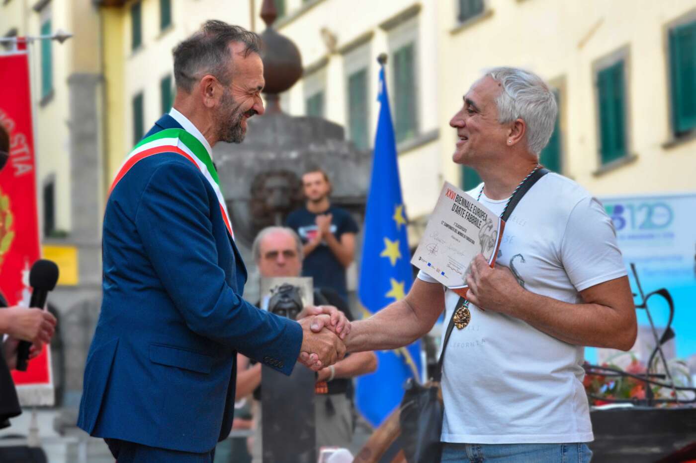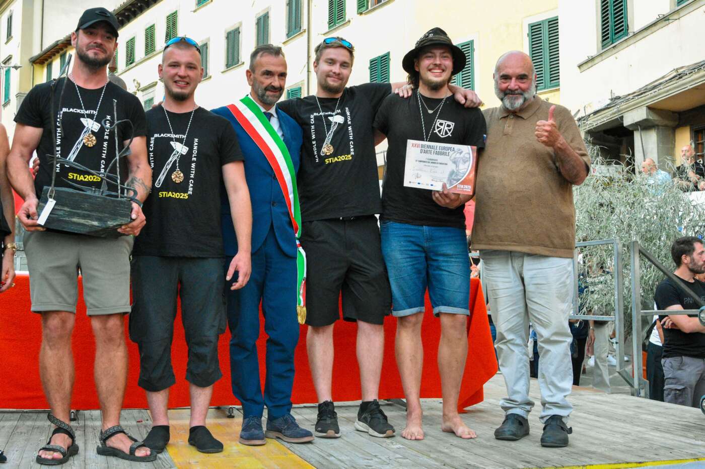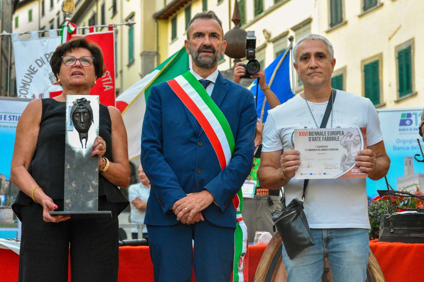 Prima delle premiazioni la presidente dell’Associazione autonoma dell’arte fabbrile Maria Gemma Bendoni e il Sindaco di Pratovecchio Stia Luca Santini hanno invitato sul palco di Piazza Tanucci la delegazione di fabbri lituani che ha donato all’associazione una croce realizzata appositamente per la Biennale per essere custodita nella Chiesa della Madonna del Ponte di Stia, che in questi giorni ha ospitato la mostra di croci lituane “Cento soli di ferro”. Sono state poi invitate le delegazioni provenienti dagli Stati Uniti e dalla Siciliache hanno realizzato due sculture, rispettivamente ispirate alla natura e all’Etna, destinate alla città di Stia. A seguire è stato letto un toccante ricordo di Giovanni Zeppieri, fabbro presente alla Biennale sin dalla prima edizione e scomparso quest’anno, tratto da uno scritto di Pier Luigi della Bordella.