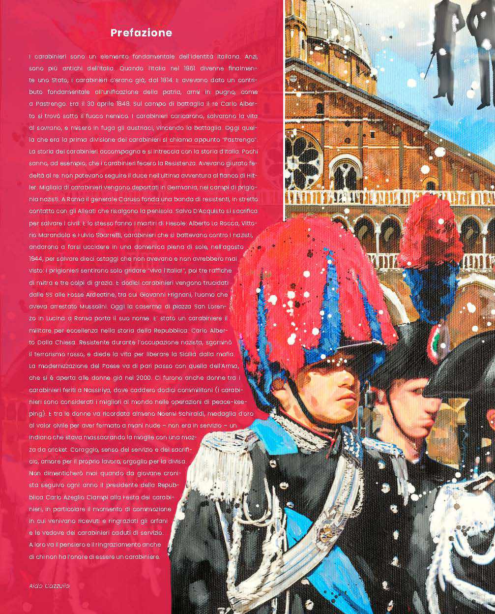 La prefazione, firmata da Aldo Cazzullo, offre uno sguardo storico e valoriale sull’Arma, ricordando come i Carabinieri, nati nel 1814, abbiano attraversato la storia d’Italia fino a oggi, protagonisti dei momenti fondativi della Nazione — dal Risorgimento alla Resistenza, fino alla modernità — rappresentando un simbolo di unità e sacrificio. Ed è a quei Carabinieri, che hanno pagato con la propria vita, che rivolge un commosso pensiero e ringraziamento.