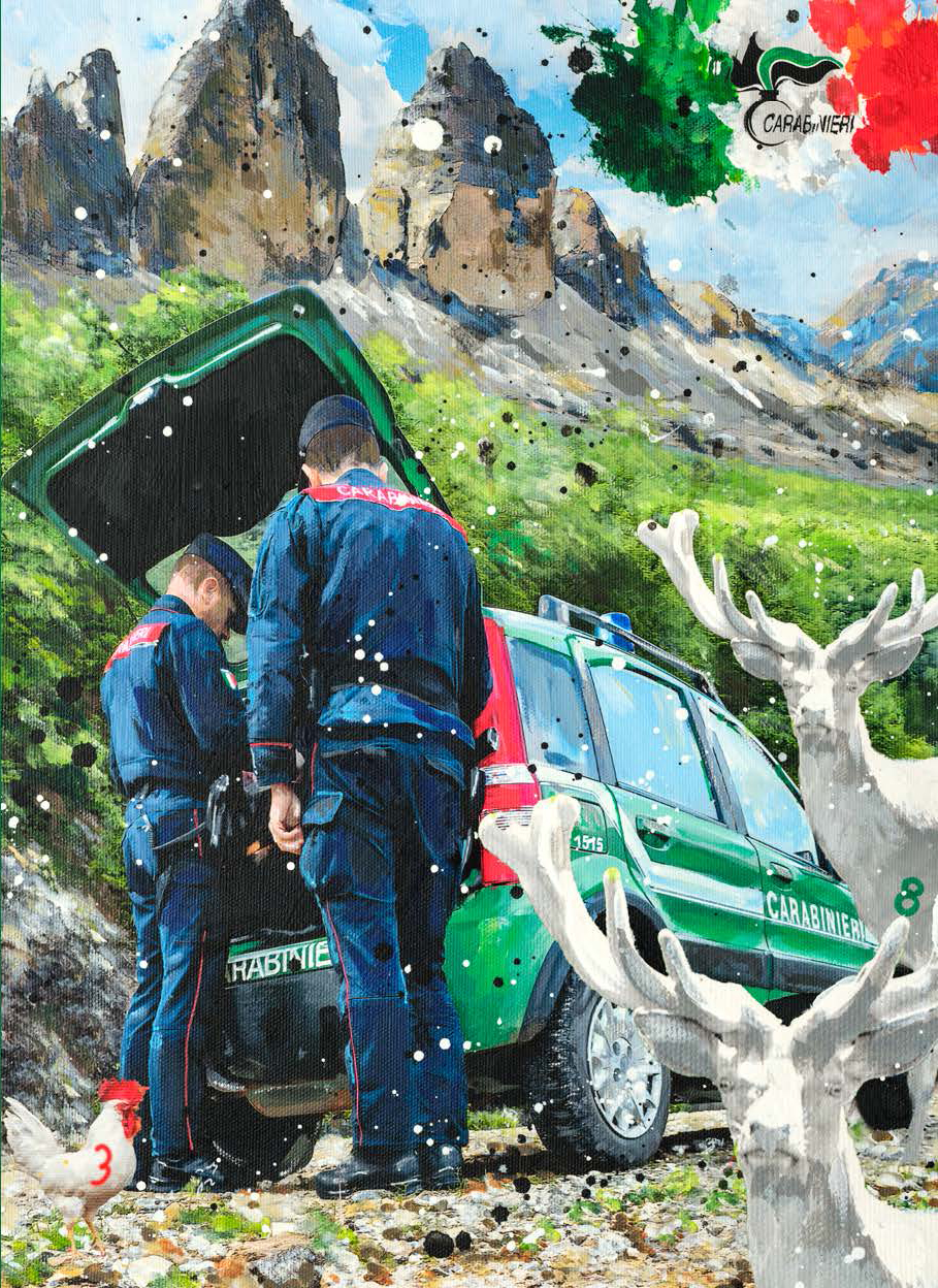 La nostra offerta di sicurezza è illustrata dalle tavole di Renè, al secolo Luigi Valeno, un maestro della nuova Pop Art che prosegue la sequenza pittorica di varie edizioni recenti. Le sue opere raffigurano i carabinieri sugli sfondi più belli, le unità mobili e specializzate, le componenti del pronto intervento.